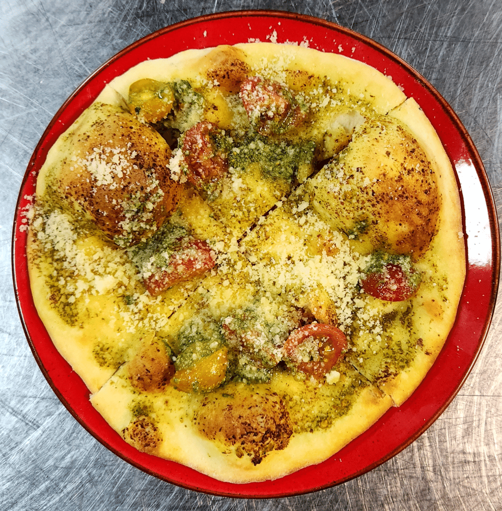 Тонкая лепешка с соусом песто, томатами черри и пармезаном
