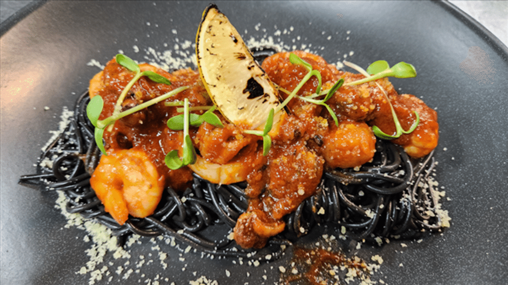Спагетти с чернилами каракатицы, мидии, кальмары, мини-осьминог, морской гребешок и креветки в томатном соусе