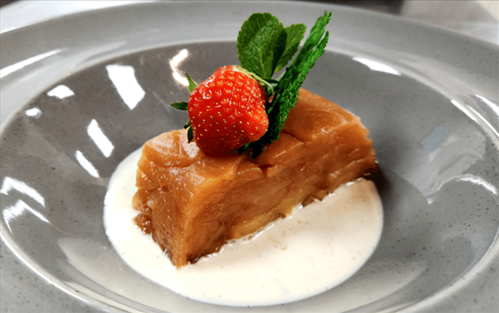 Сладкое яблоко, запеченное тонкими слоями, подается с ванильным соусом