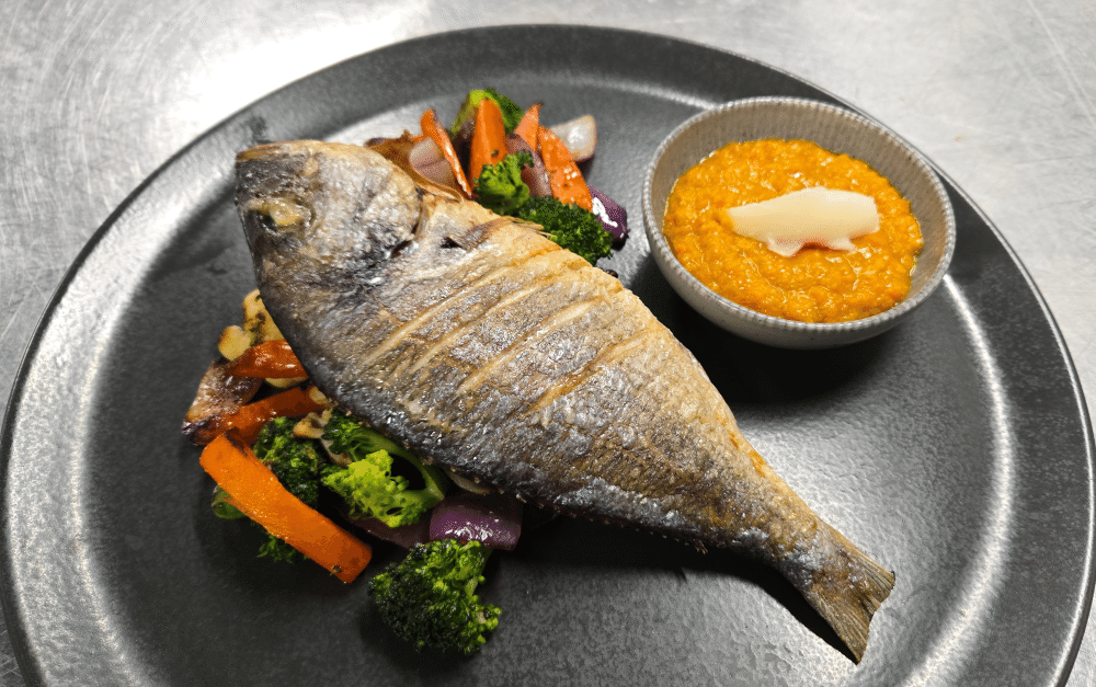 Жареная дорадо с овощами (брокколи, морковь, лук), морковно-кокосовый соус