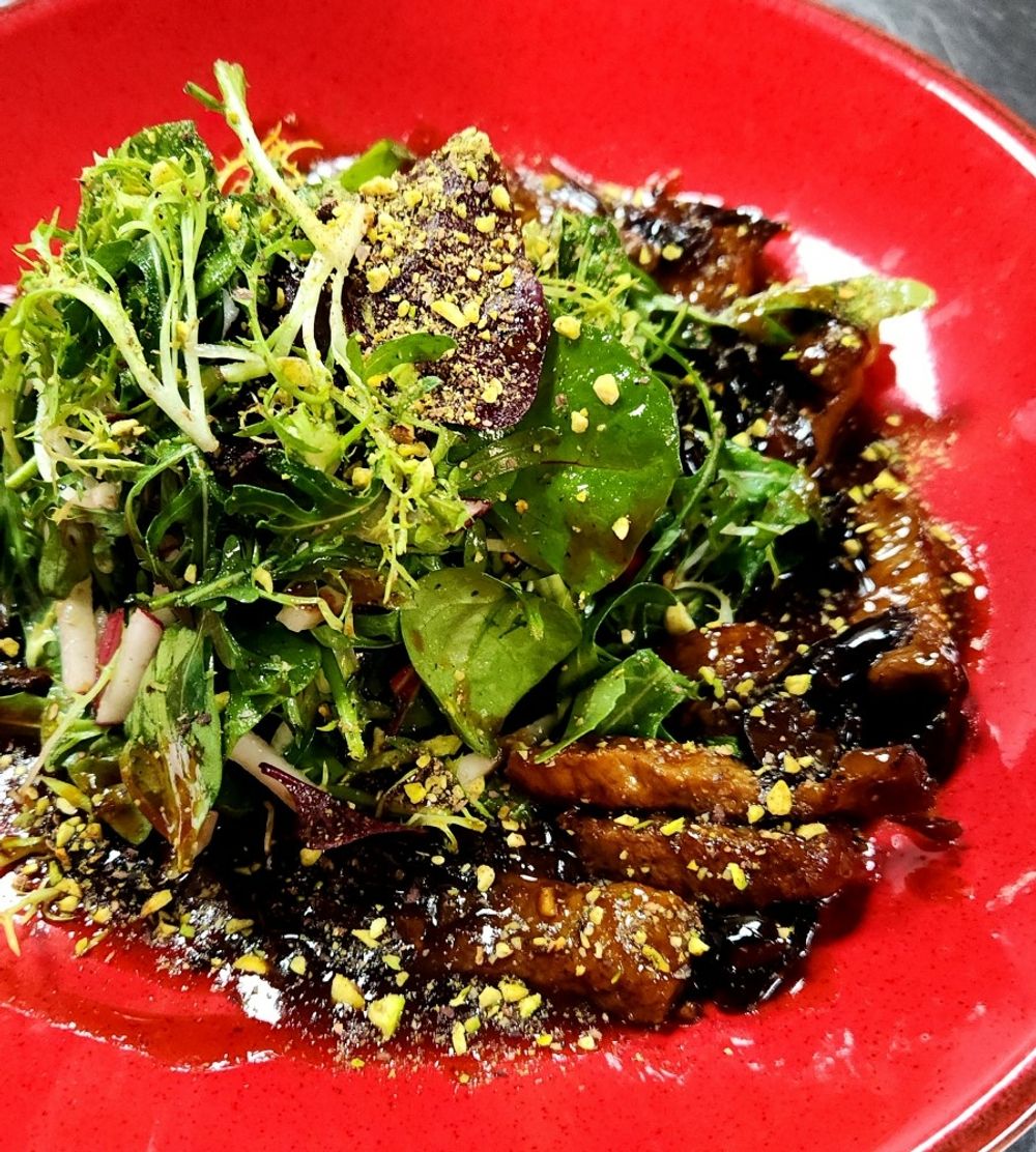 Микс-салат с мякотью телятины и черносливом в соусе Терияки