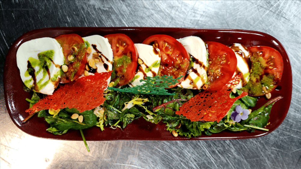 Помидор с моцареллой, соусом песто и кедровыми орешками
