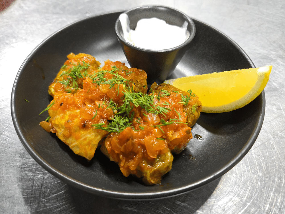 Мини-голубцы с телячьим фаршем в томатном соусе, подаётся со сметаной