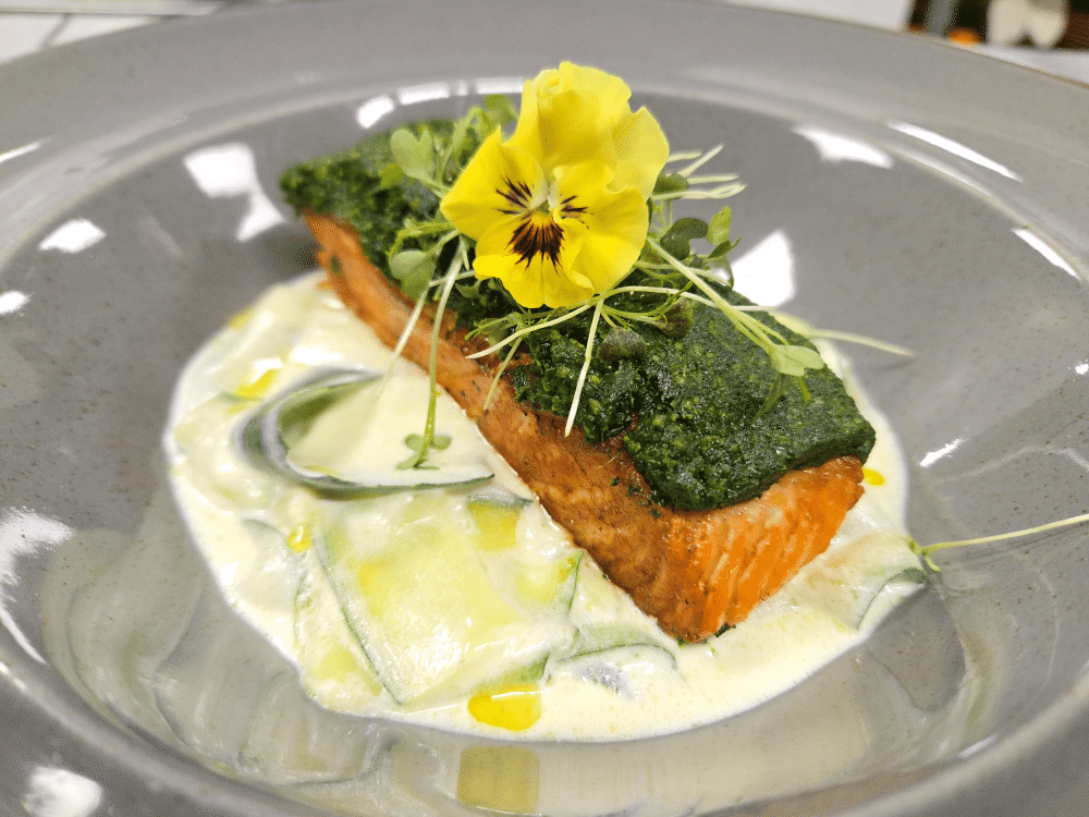 Филе семги под корочкой из укропа с пармезаном, подается с цукини в сливочном соусе