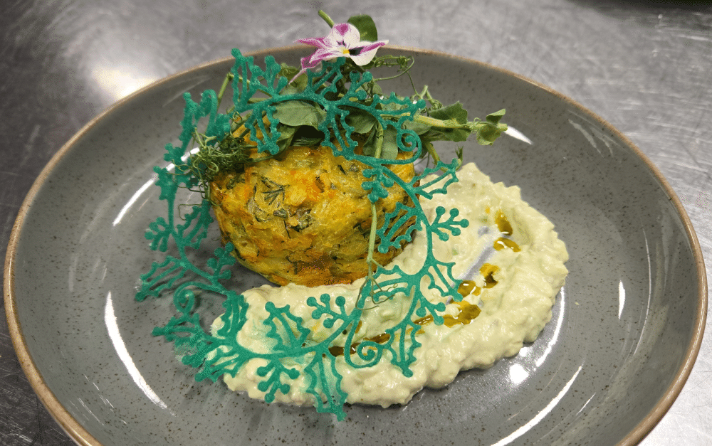 Рисовый пирог с яйцом, укропом и зеленым луком, подается со сливочным гуакамоле