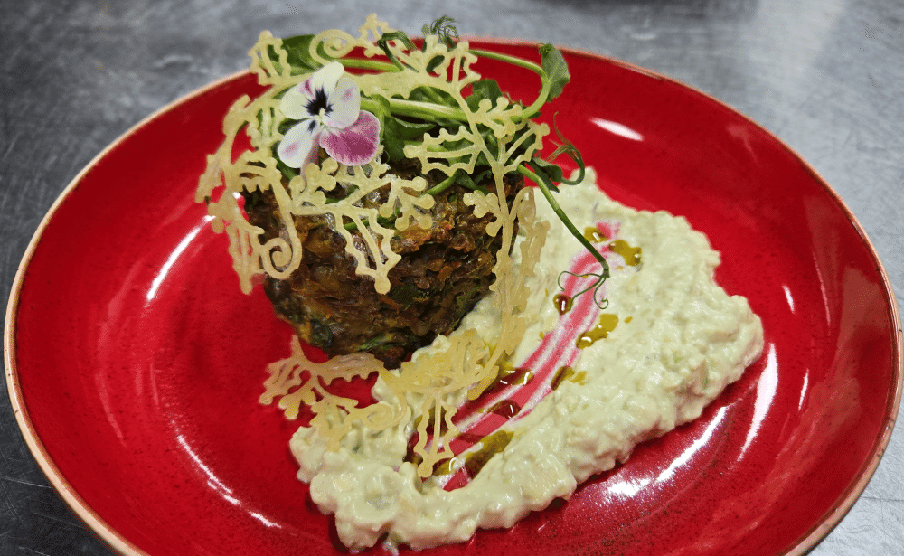 Гречневый пирог на яичном белке с зеленью, подается со сливочным гуакамоле