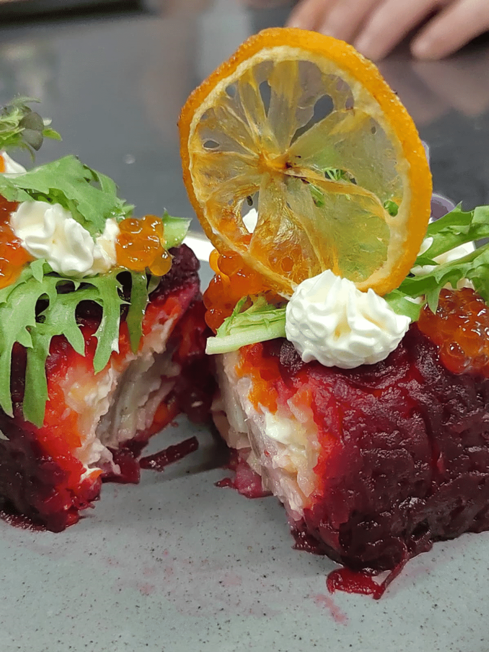 Классический салат "Сельдь под шубой" в виде рулета с декором из красной икры и сливочного сыра
